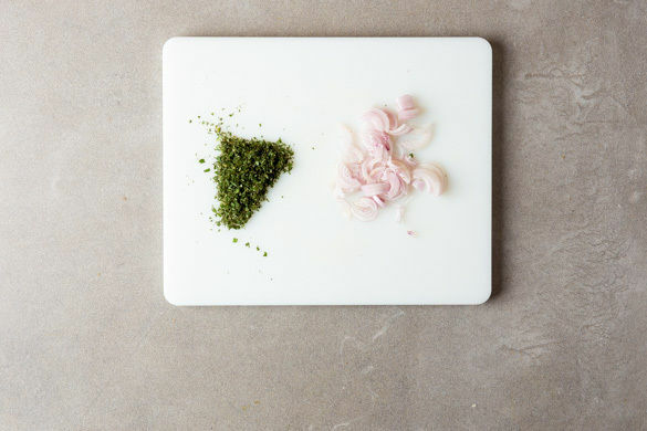 In einem großen Topf ausreichend gesalzenes Wasser für die Pasta zum Kochen bringen. Die Salbeiblätter von den Stängeln zupfen und fein schneiden. Die Schalotten schälen, halbieren und in feine Streifen schneiden.