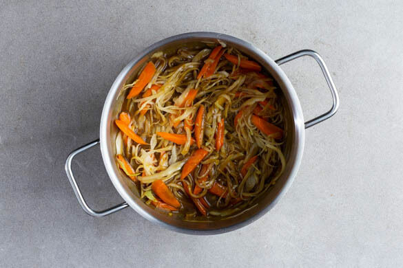 Wenn die Sauce 5–6Min. gekocht hat, die Karotten und den Weißkohl zugeben und ca. 6Min. abgedeckt in der Sauce garen. Das Gemüse sollte noch etwas Biss haben. Die Sauce mit 1EL hellem Essig, ggf. mehr Brühgewürz oder Salz sowie Pfeffer abschmecken.