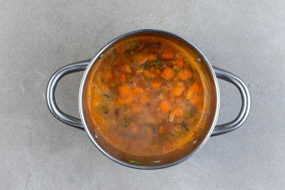 Die ½ des Tomatenmarks zum Gemüse in den Topf geben und kurz mitbraten, dann mit 1,2L heißem Wasser ablöschen. Das Brühgewürz und 1TL Salz unterrühren und den Eintopf bei niedrigster Hitze 3–4Min. sanft köcheln lassen.