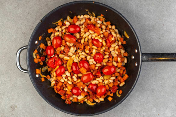 Die Kirschtomaten und 100ml Wasser in die Pfanne geben. Die Tomaten mit einem Spatel leicht zerdrücken, damit sie aufplatzen, dann bei starker Hitze 3–5Min. mitbraten. Die Bohnen in einem Sieb mit kaltem Wasser abspülen, abtropfen lassen, in die Pfanne geben und durchschwenken, um sie leicht zu erwärmen. Mit Salz und Pfeffer abschmecken.