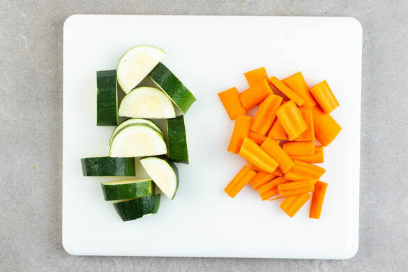 Den Backofen auf 240°C (220ºC Umluft) vorheizen. In einem kleinen Topf ausreichend Wasser für die Eier aufkochen. Die Karotte ggf. schälen, längs halbieren und quer in 2–3cm dicke Scheiben schneiden. Die Zucchini ebenfalls längs halbieren und quer in 2–3cm dicke Scheiben schneiden.