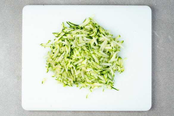 Die Zucchini grob raspeln und in einem sauberen Küchentuch oder in einem Sieb gut ausdrücken, um möglichst viel Flüssigkeit zu entfernen.