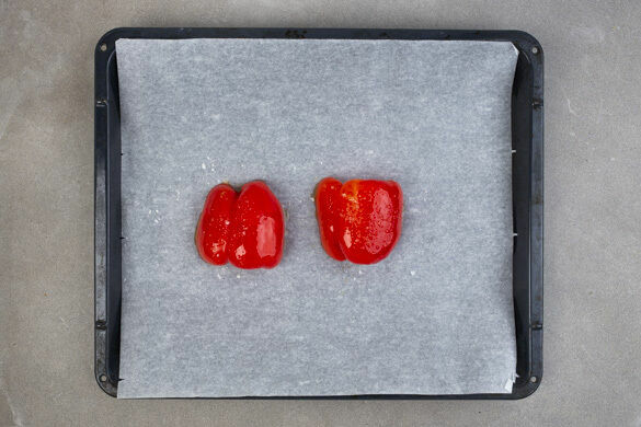 Den Backofen mit Grillfunktion oder Ober-/ Unterhitze auf 250°C vorheizen. Die Paprika halbieren, entkernen und mit der Schnittfläche nach unten auf ein mit Backpapier ausgelegtes Backblech geben. Mit 1TL Olivenöl bestreichen und mit 1 Prise Salz würzen, dann ca. 15Min. auf der oberen Schiene im Öfen rösten, bis die Haut dunkle Blasen wirft. Aus dem Ofen nehmen und etwas abkühlen lassen.