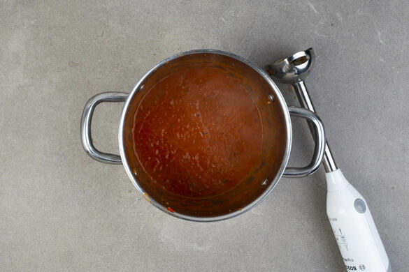 Die Tomaten grob würfeln und mit der Paprika, dem Brühgewürz, den gehackten Tomaten und 200ml Wasser zu den Zwiebeln in den Topf geben, unterrühren und die Suppe ca. 10Min. köcheln lassen. Die Suppe vom Herd nehmen, mit einem Stabmixer pürieren und mit 2TL Essig, ½–1TL Zucker sowie Salz und Pfeffer abschmecken. Die Suppe nach Belieben mit etwas Wasser verdünnen.