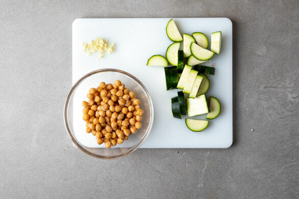Die Kichererbsen in ein Sieb abgießen, kalt abspülen und abtropfen lassen. Die Zucchini längs halbieren und in ca. 1cm breite Scheiben schneiden. Den Knoblauch schälen und fein würfeln.