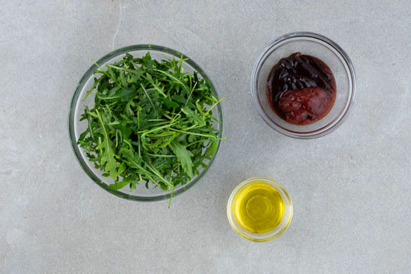 Den Rucola ggf. verlesen. 2EL Olivenöl mit 2TL Essig sowie je 1 kräftigen Prise Salz und Pfeffer zu einem Dressing verrühren und kurz vor dem Servieren mit dem Rucola vermengen. Für den Dip die Hoisinsauce mit 4EL Ketchup verrühren.
