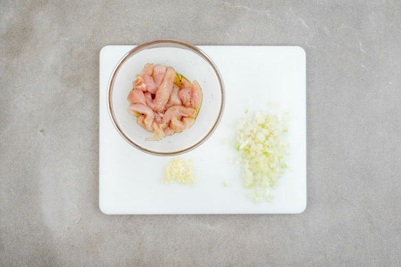 Das Fleisch trocken tupfen und anschließend in ca. 1cm breite und ca. 5cm lange Streifen schneiden. Mit 3EL Olivenöl sowie je ½TL Salz und Pfeffer vermengen. Die Zwiebel schälen, halbieren und in feine Würfel schneiden. Den Knoblauch schälen und ebenfalls fein würfeln. In einem großen Topf ausreichend gesalzenes Wasser für die Pasta zum Kochen bringen.