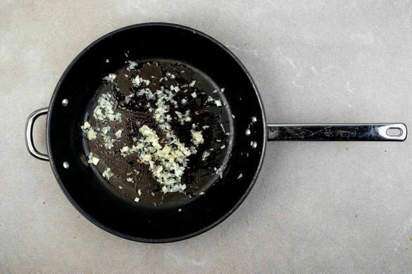 Die Zwiebeln in einer großen Pfanne mit 1EL Olivenöl 2–3Min. bei mittlerer Hitze glasig anbraten, dann aus der Pfanne nehmen. In derselben Pfanne die Auberginen und die Paprika mit 1EL Olivenöl bei starker Hitze 3–4Min. scharf anbraten. Die Zwiebeln zurück in die Pfanne geben, den Knoblauch beifügen, mit 1 Prise Zucker würzen und 1–2Min. weiterbraten.