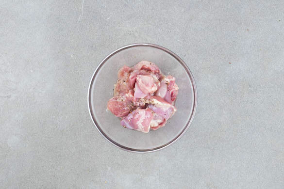 Den Backofen auf 240°C (220°C Umluft) vorheizen. Das Fleisch trocken tupfen und in 1–2cm dünne Stücke schneiden, dann mit 1EL Essig sowie je 1 Prise Salz und Pfeffer vermengen und beiseitestellen.