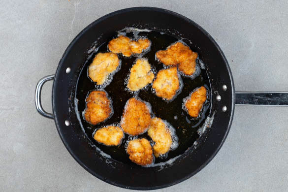 Eine große Pfanne ca. 1cm hoch mit Pflanzenöl befüllen und dieses mittelhoch erhitzen. Die Hähnchenteile auf jeder Seite 2–3Min. goldbraun ausbacken, anschließend auf etwas Küchenkrepp abtropfen lassen. Das Hähnchen mit den Gemüsepommes und dem Rucolasalat anrichten, mit den Lauchzwiebeln garnieren und mit dem Hoisin-Dip servieren.