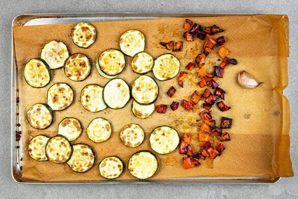 Die Paprikawürfel auf einer Seite eines mit Backpapier ausgelegten Backblechs mit 2TL Olivenöl vermengen. Die Zucchini auf der anderen Seite mit 4TL Olivenöl vermengen und das Gemüse mit 1 kräftigen Prise Salz würzen. Den Knoblauch samt Schale auf das Blech legen und alles im mittleren Teil des Ofens 20–24Min. backen, bis das Gemüse Röstspuren aufweist und sehr weich ist.