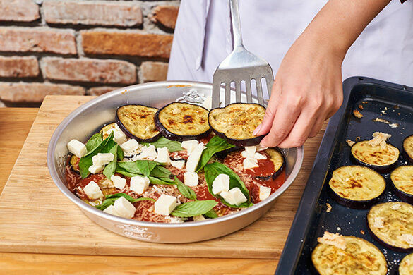 Ein köstlicher Gemüseauflauf aus der italienischen Küche wird heute serviert mit einem frischen Salat mit knusprigen Croûtons. Wenn die gegrillten Auberginen geschichtet mit leckerer Tomatensauce, Käse und Basilikum unter einer Knusperhaube im Ofen garen, wirst du erfüllt sein von Vorfreude – diese herrlichen, verheißungsvollen Düfte! Wir versprechen dir ein vegetarisches Mahl vom Feinsten!
