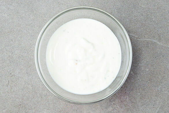 Den Knoblauch zerdrücken und unter den Joghurt rühren. Mit Salz und Pfeffer abschmecken.