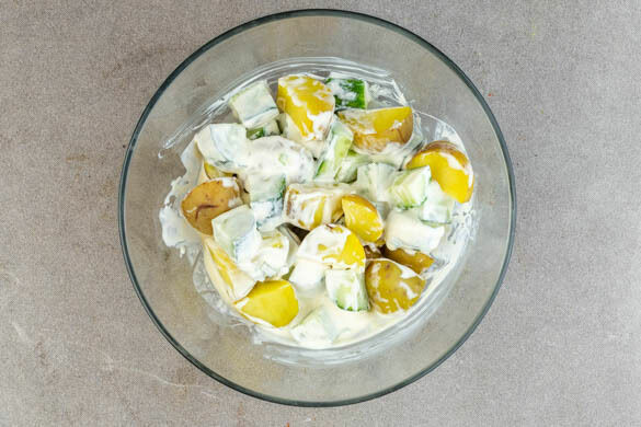 Die Gurke längs vierteln und in ca. 2cm breite Scheiben schneiden. Die Gurken und die Kartoffeln mit dem Dressing vermengen. Den Fisch mit kaltem Wasser abspülen, trocken tupfen und evtl. vorhandene Gräten und Schuppen entfernen.