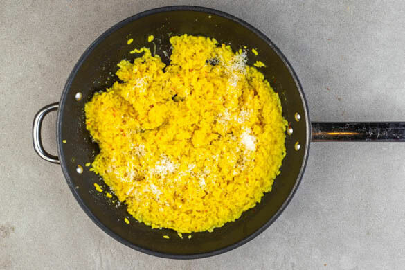 Die ½ des Knoblauchs mit 1EL Olivenöl in einer großen Pfanne bei schwacher bis mittlerer Hitze ca. 1Min. anbraten. Den Reis zugeben und ca. 2Min. mitbraten. Den Safran samt Wasser einrühren und ca. 1Min. mitbraten. Nach und nach mit der Brühe ablöschen und stetig rühren. Diesen Vorgang 18–20Min. lang wiederholen, bis die Brühe aufgebraucht und der Reis bissfest ist.