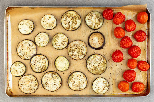 Die Auberginen und die Kirschtomaten auf ein mit Backpapier ausgelegtes Backblech legen. Die Auberginen mit einer Gabel einstechen. 4EL Olivenöl über die Auberginen und die Kirschtomaten träufeln, mit ½TL Salz und 1 kräftigen Prise Pfeffer würzen und das Gemüse 12–15Min. im Ofen backen.