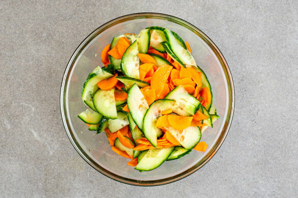 Die Karotte ggf. schälen, dann mit der Gurke längs halbieren und schräg in dünne Scheiben schneiden. Die Limette halbieren und auspressen. Den Limettensaft mit 1EL Pflanzenöl, 2TL hellem Essig, 2TL Zucker und 1 kräftigen Prise Salz verrühren. Das Dressing mit den Gurken und den Karotten zu einem Salat vermengen.