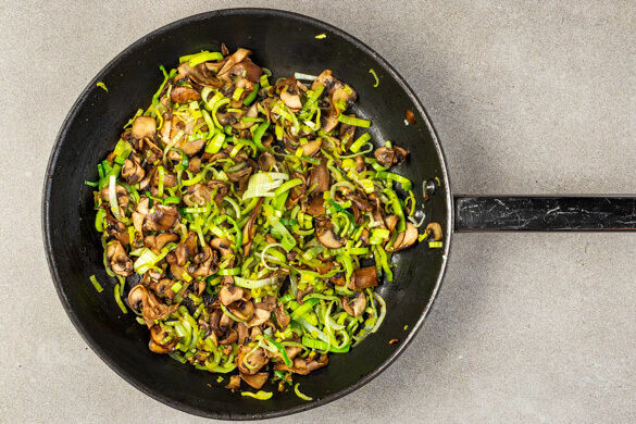 Den Lauch längs halbieren und quer in feine Streifen schneiden, dann zu den Pilzen in die Pfanne geben und 3–4Min. mitbraten.