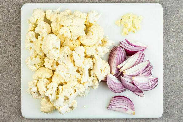 Den Backofen auf 240°C (220°C Umluft) vorheizen. Den Blumenkohl in mundgerechte Röschen schneiden. Die Zwiebeln schälen, halbieren und in dünne Spalten schneiden. Den Knoblauch schälen und in feine Scheibchen schneiden.