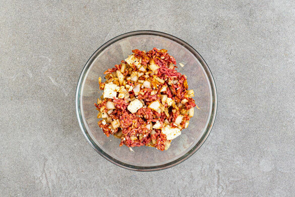 Die Walnüsse grob hacken, dann in einer mittelgroßen Pfanne ohne Zugabe von Fett bei mittlerer Hitze 1–2Min. anrösten. Vorsicht, sie können schnell zu dunkel werden. Zum Abkühlen aus der Pfanne nehmen und beiseitestellen. Den Feta grob zerkrümeln und mit dem Hackfleisch, den Zwiebeln, der Gewürzmischung sowie je 1 kräftigen Prise Salz und Pfeffer vermengen.