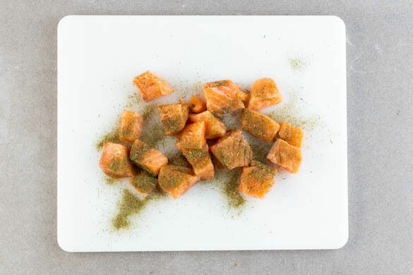 Den Fisch mit kaltem Wasser abspülen und trocken tupfen. Mit einem scharfen Messer die Haut vorsichtig abziehen und evtl. vorhandene Gräten entfernen, dann den Fisch in 1–2cm große Würfel schneiden und mit der Gewürzmischung einreiben.