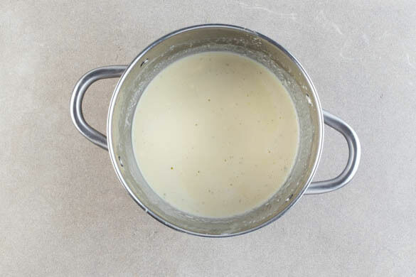 Die Zwiebeln und den Knoblauch in einem großen Topf mit 2EL Butter bei mittlerer Hitze ca. 1Min. anschwitzen. Mit 1L Wasser ablöschen, das Brühgewürz unterrühren und die Suppe 3–4Min. sanft köcheln lassen. Dann die Crème fraîche unterrühren und die Suppe mit einem Stabmixer pürieren.