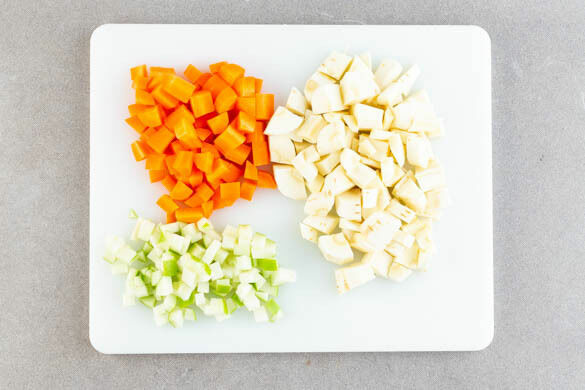 Die Pastinaken schälen und in ca. 1cm kleine Würfel schneiden. Die Karotten ggf. schälen, längs vierteln und ebenfalls in ca. 1cm große Würfel schneiden. Den Apfel halbieren, entkernen und in ca. 0,5cm kleine Würfel schneiden.