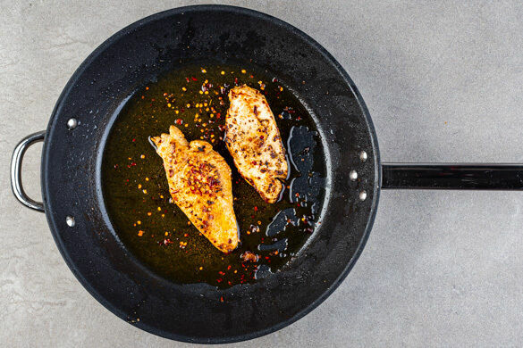 Das Fleisch in einer großen Pfanne bei mittlerer Hitze auf jeder Seite 3–4Min. braten, bis das Fleisch goldbraun und durch ist. Anschließend auf einem Teller abgedeckt ruhen lassen.