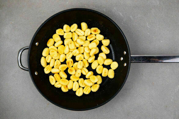 Parallel in einer zweiten großen Pfanne die Gnocchi mit 2EL Olivenöl bei mittlerer bis starker Hitze in 6–7Min. goldbraun und knusprig anbraten. Den Käse fein reiben.