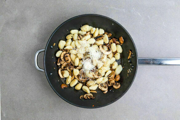 Die Pilze mit der ½ des Käses und 100–150ml Wasser zu den Gnocchi in die Pfanne geben, alles gut verrühren und ca. 2Min. erwärmen, bis eine cremige Sauce entsteht. Falls erforderlich, löffelweise mehr Wasser hinzugeben. Falls die Sauce zu dünn ist, etwas länger eindicken lassen. Mit Salz und Pfeffer abschmecken.