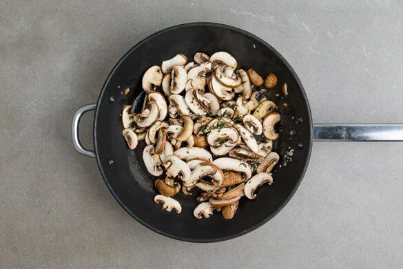 Die Champignons ggf. säubern, in dünne Scheiben schneiden und in der Pfanne mit 1EL Olivenöl bei mittlerer bis starker Hitze 6–8Min. braten, dabei möglichst nicht umrühren. Tipp: Wer mag, kann die Pilze auch in Butter anbraten. Den Knoblauch und den Thymian mit 1 Prise Salz hinzugeben und ca. 1Min. mitbraten. Die Walnüsse grob hacken.