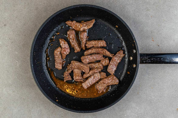 Das Fleisch mit 2EL Pflanzenöl in einem Wok oder einer großen Pfanne bei starker Hitze in 1–2Min. gar braten und mit 1 kräftigen Prise Salz würzen.