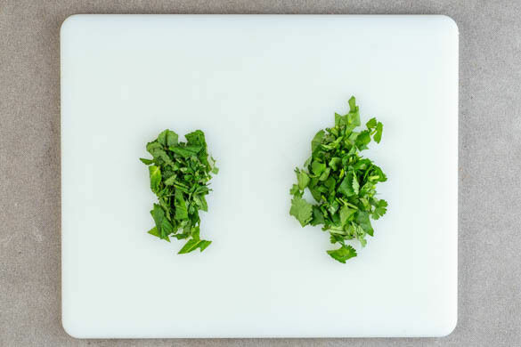Die Minzeblätter von den Stängeln zupfen und grob schneiden. Den Koriander samt Stängeln ebenfalls grob schneiden. Das Fleisch auf dem Nudelsalat anrichten und mit den Kräutern, den Erdnüssen und den Röstzwiebeln garniert servieren.