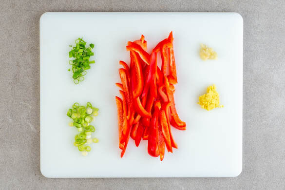 Den weißen Teil und den grünen Teil der Lauchzwiebeln getrennt in feine Ringe schneiden. Die Paprika vierteln, entkernen und in dünne Streifen schneiden. Den Knoblauch schälen und fein würfeln. Den Ingwer schälen und fein reiben, bis ca. 2EL geriebener Ingwer vorhanden sind.