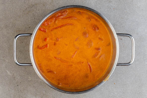 2TL Pflanzenöl und die Currypaste in den Topf geben und 1–2Min. anbraten, bis die Paste gut verbunden ist und die Paste duftet. Die gehackten Tomaten, die Kokosmilch, 1L Wasser und das Brühgewürz hinzugeben und zum Kochen bringen, dann die Hitze reduzieren und die Suppe ca. 10Min. köcheln lassen, dabei gelegentlich umrühren.