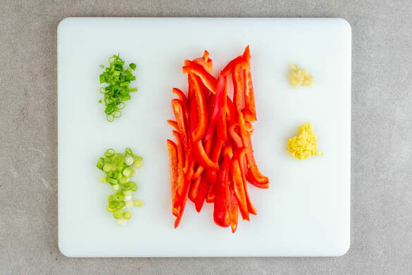Den weißen Teil und den grünen Teil der Lauchzwiebel getrennt in feine Ringe schneiden. Die Paprika vierteln, entkernen und in dünne Streifen schneiden. Den Knoblauch schälen und fein würfeln. Den Ingwer schälen und fein reiben, bis ca. 1EL geriebener Ingwer vorhanden ist.