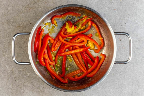 Die Paprika und die weißen Lauchzwiebelringe in dem Topf mit 1EL Pflanzenöl und 1 kräftigen Prise Salz bei mittlerer Hitze 5–6Min. anbraten. Dann den Knoblauch und den Ingwer hinzugeben und ca. 1Min. duftend mitbraten.