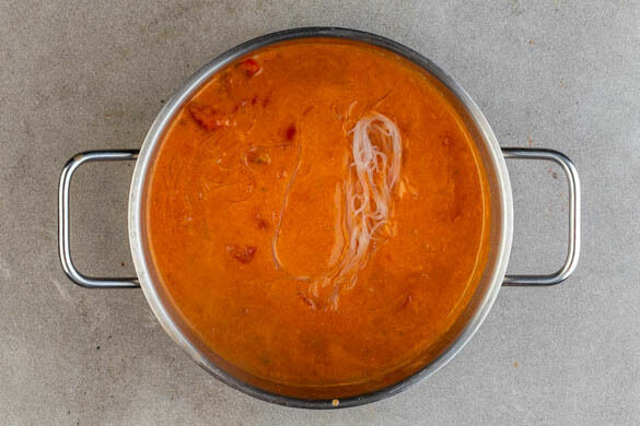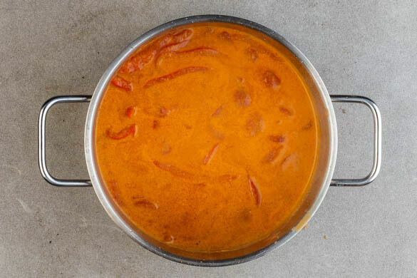 1TL Pflanzenöl und die ½ der Currypaste in den Topf geben und 1–2Min. anbraten, bis die Paste alles gut verbunden ist und die Paste duftet. Die gehackten Tomaten, die Kokosmilch, 500ml Wasser und die ½ des Brühgewürzes hinzugeben und zum Kochen bringen, dann die Hitze reduzieren und die Suppe ca. 10Min. köcheln lassen, dabei gelegentlich umrühren.