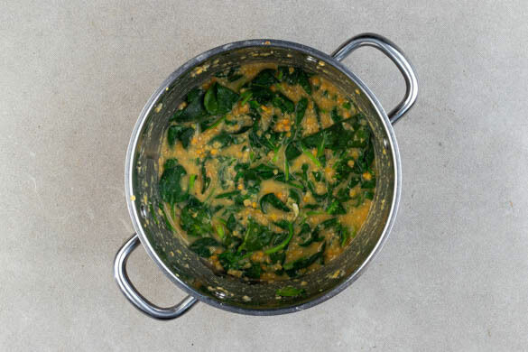 500ml heißes Wasser angießen, die ½ des Brühgewürzes einrühren und die Linsen zugeben. Unter gelegentlichem Rühren 20–25Min. köcheln lassen, bis das Wasser größtenteils aufgesogen ist und die Linsen gar sind, ggf. mehr Wasser zugeben.