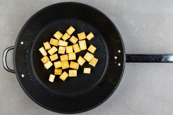 Die Tofuwürfel in einer großen Pfanne mit 2EL Pflanzenöl bei mittlerer bis starker Hitze in ca. 11Min. rundum goldbraun braten. Den Tofu aus der Pfanne nehmen und beiseitestellen, die Pfanne aufbewahren.
