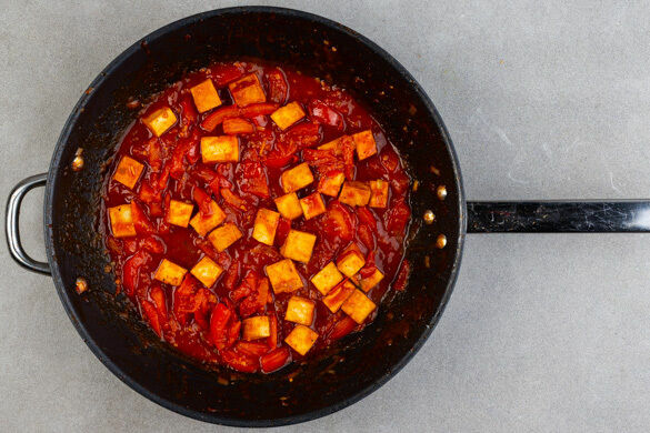 Den Knoblauch und das Tomatenmark in derselben Pfanne mit 2EL Pflanzenöl ca. 30Sek. anschwitzen, den weißen Teil der Lauchzwiebeln und die Tomaten zugeben und ca. 2Min. braten. Die Sojasauce, 200ml Wasser, 2EL (braunen) Zucker und 1 Prise Pfeffer unterrühren. Den Tofu zugeben und ca. 10Min. abgedeckt bei niedriger Hitze köcheln lassen. Mit Salz und Pfeffer abschmecken.