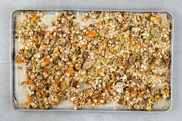 Ob Frühstück oder Pause am Nachmittag: Wenn du auf der Suche nach einem Energieschub bist, ist ein leckeres Granola genau das Richtige für dich! Ahornsirup und Granatapfelmelasse sowie orientalische Gewürze werden mit einer köstlichen Mischung aus Haferflocken, Pistazien, Mandeln, getrockneten Aprikosen und Datteln vermengt und knusprig gebacken. Mit cremigem Joghurt besonders fein!