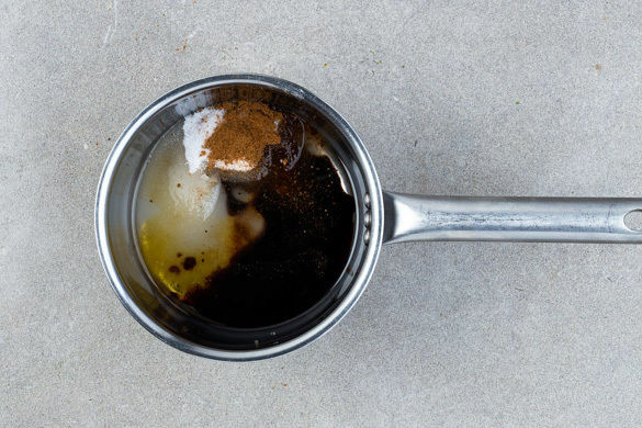 Den Ahornsirup, die Granatapfelmelasse, die ½ der Gewürzmischung, 3EL Pflanzenöl und 2EL Zucker in einem kleinen Topf verrühren und bei mittlerer Hitze langsam erwärmen, bis sich der Zucker aufgelöst hat und alles gut verbunden ist.