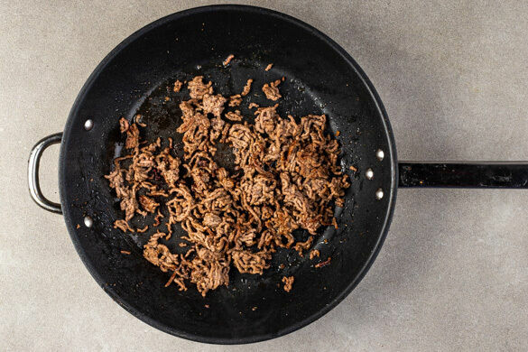 Das Hackfleisch in einer großen Pfanne mit 2EL Pflanzenöl sowie ½TL Kreuzkümmel-Gewürzmischung und ½TL Salz bei starker Hitze ca. 2Min. kross anbraten, dabei gelegentlich umrühren.
