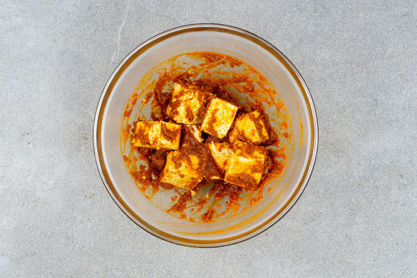 In einem mittelgroßen Topf 600ml leicht gesalzenes Wasser für den Reis zum Kochen bringen. Den Tofu in mundgerechte Würfel schneiden und mit 2TL Pflanzenöl sowie ⅓ der Currypaste vermengen. Bis zur weiteren Verwendung beiseitestellen.