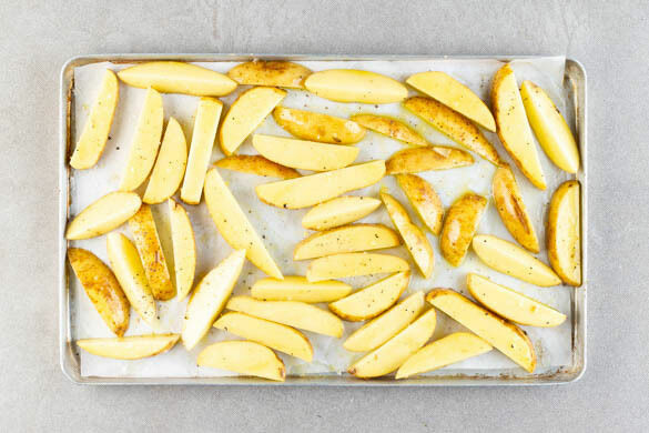 Den Backofen auf 250°C (230°C Umluft) vorheizen. Die Kartoffeln samt Schale in breite Spalten schneiden, auf zwei mit Backpapier ausgelegten Backblechen mit 2EL Pflanzenöl und je ½TL Salz und Pfeffer vermengen und 25–30Min. im Ofen goldbraun backen. Nach der Hälfte der Zeit wenden und die Position der Bleche tauschen.