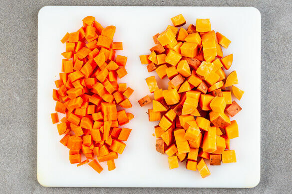 Den Backofen auf 240°C (220°C Umluft) vorheizen. Die Süßkartoffeln samt Schale in ca. 2cm große Würfel schneiden. Die Karotte ggf. schälen und ebenfalls in ca. 2cm große Würfel schneiden.