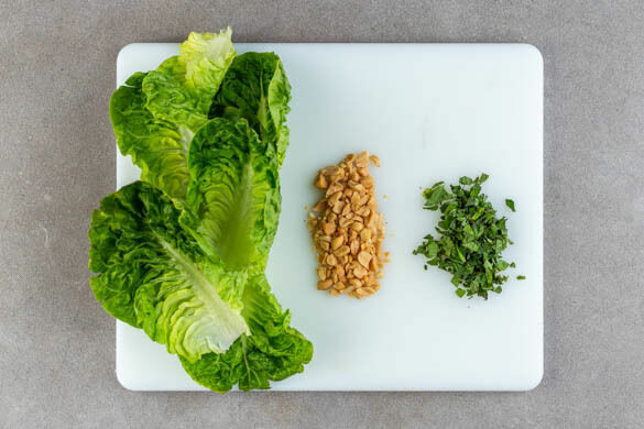 Den Salat in einzelne Blätter zerteilen. Die Erdnüsse grob hacken. Die Minze samt weichen Stängeln grob schneiden.
