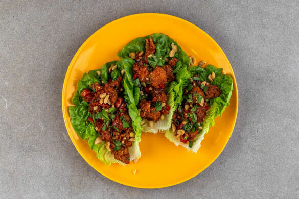 Die Salatblätter mit der veganen Hackmischung füllen und mit den Erdnüssen und der Minze garnieren. Die Salatschiffchen mit der Sauce servieren.