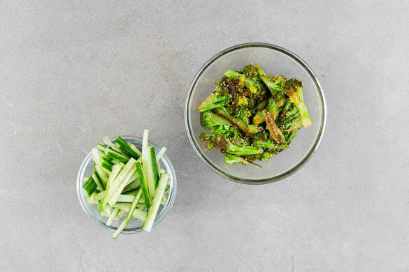 Das Sesamöl mit 2EL Essig, 2EL Wasser und 1 kräftigen Prisen Salz zu einem Dressing verrühren. Die ½ des Dressings mit dem Sesam und dem gebratenen Brokkoli vermengen. Mit dem restlichen Dressing die Gurken beträufeln.